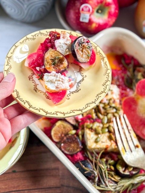 The fresh apple slices make an excellent grain-free alternative to crackers, offering a crisp, refreshing balance to the rich, savory baked feta.