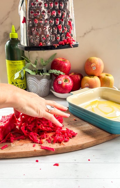 3. Shred one full Lucy Glo apple and spread it evenly in the bottom of the dish.