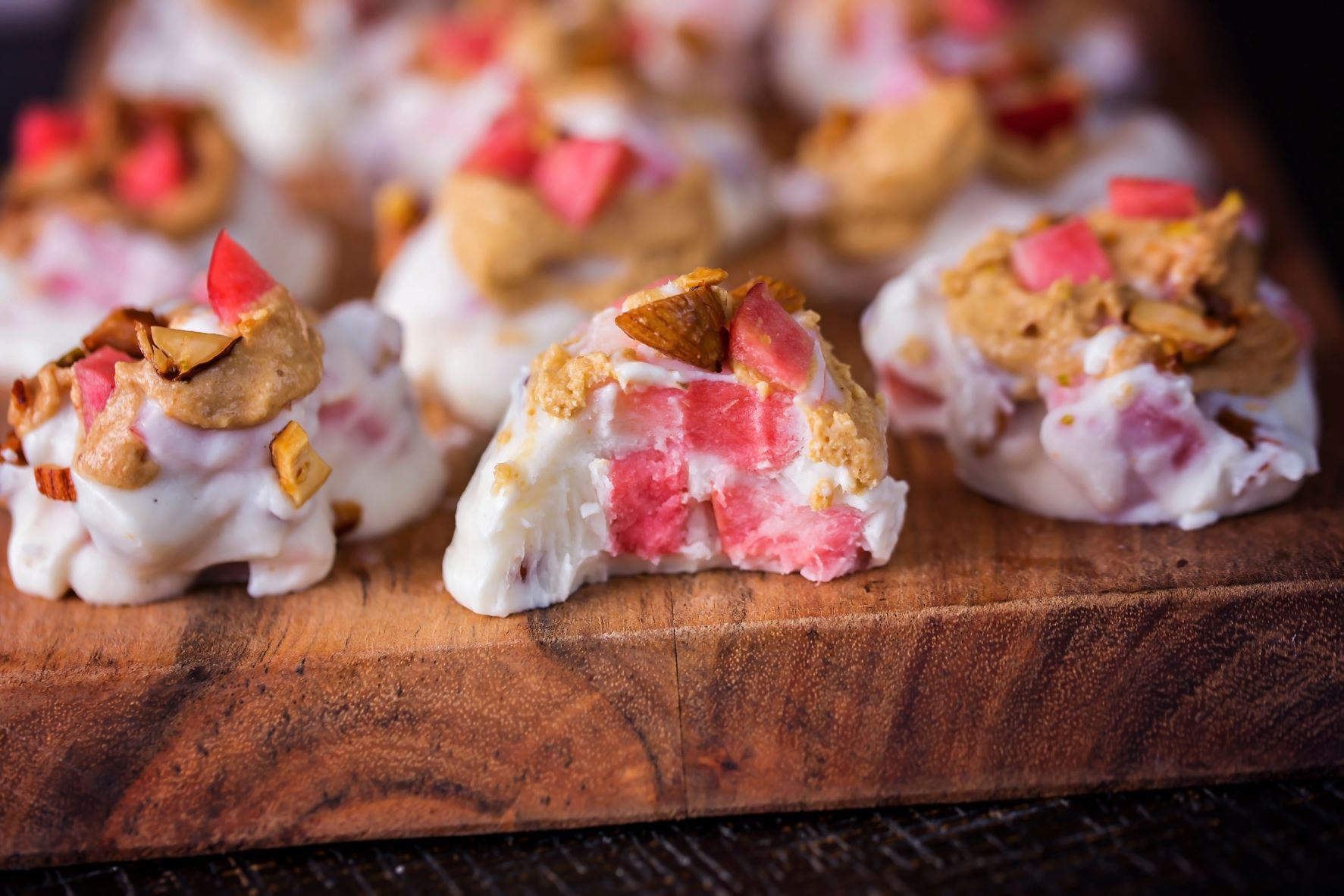 - Stir together cashew butter and 1/2 scoop protein powder. Swirl over each yogurt bomb. Top with more toasted almonds, small chopped Lucy apples. Freeze for at least one hour. Enjoy!