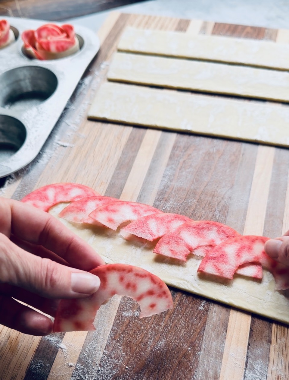 8. Carefully roll the pastry and apples from one end to the other, creating a rose-shaped pastry.