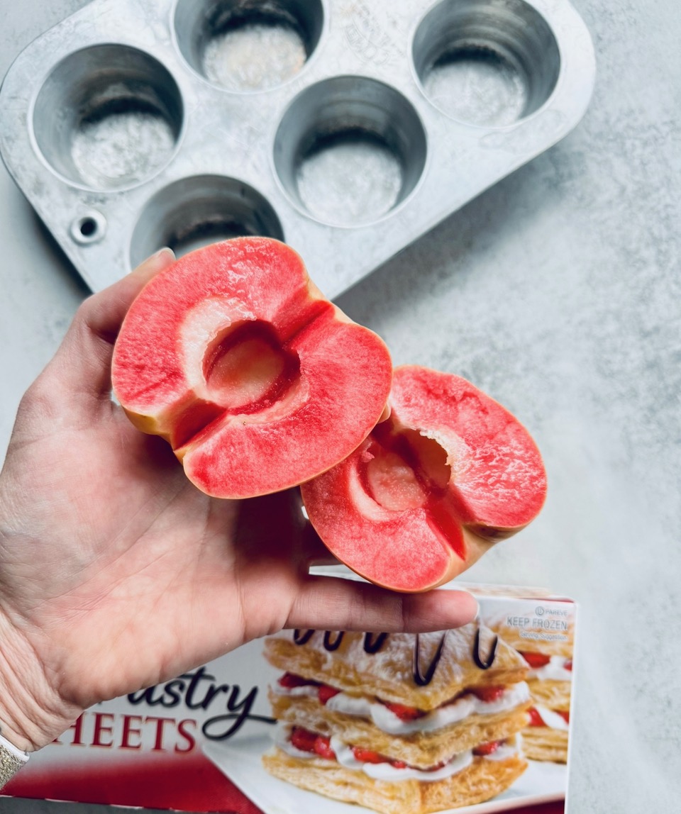 Elevate your dessert game with these elegant “rose” pastries made from buttery puff pastry and vibrant Lucy™ apples. With just a few simple ingredients,apples, lemon, apricot preserves, cinnamon, and a clever rolling technique, this recipe turns fresh fruit into a stunning swirl of flavor and color.